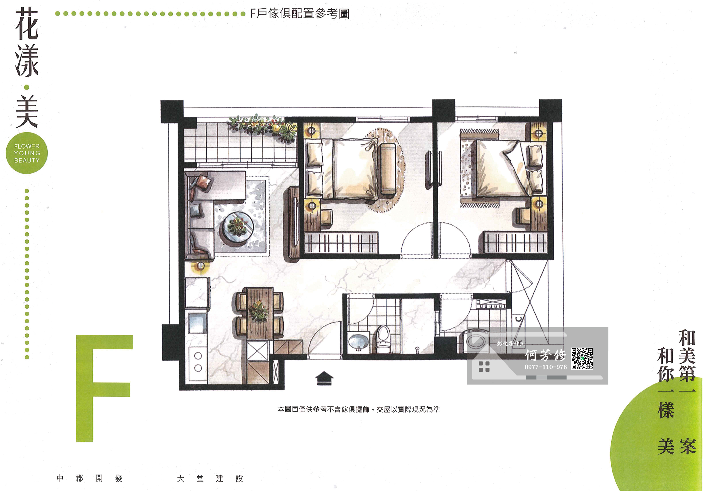 • 有關平立面規劃、戶數、外觀建材、門窗型式、工作陽台配置、衛浴設備配置、庭園及社區公共設施之項目、材料、家具及擺飾,賣方保有修正調整之權利。