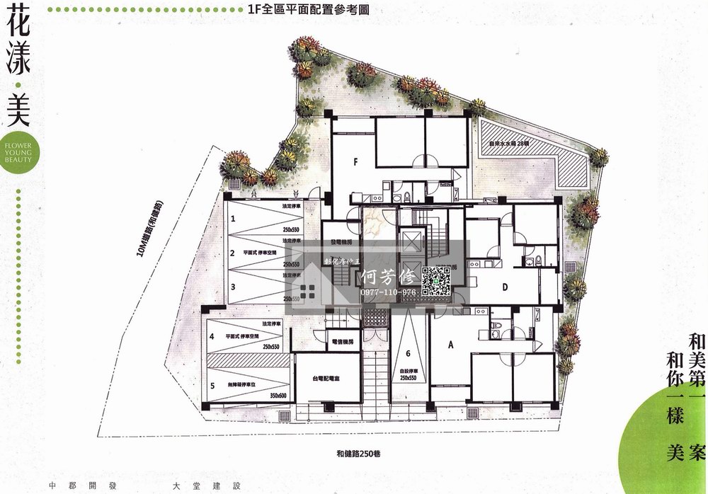 「花漾美」位於彰化縣和美鎮和健路250巷1號,由中郡開發股份有限公司投資興建,陳文慶建築師事務所建築設計,基地面積220坪、建蔽率56.64%,樓層規劃為1棟地上6層建築,共有31戶純住家,格局坪數規劃二房18.23~23.48坪。