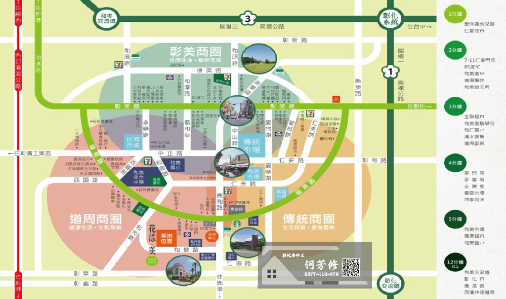 「花漾美」位於道周商圈、彰美商圈以及傳統市集交界處,夜市、全聯、傳統市場、寶雅、星巴克、四季百貨、銀行或者其他行政機關樣樣有,更有多條聯外道路交通往來順暢,工作、生活、居家、休閒,一次滿足,致力打造「5分鐘幸福生活圈」。