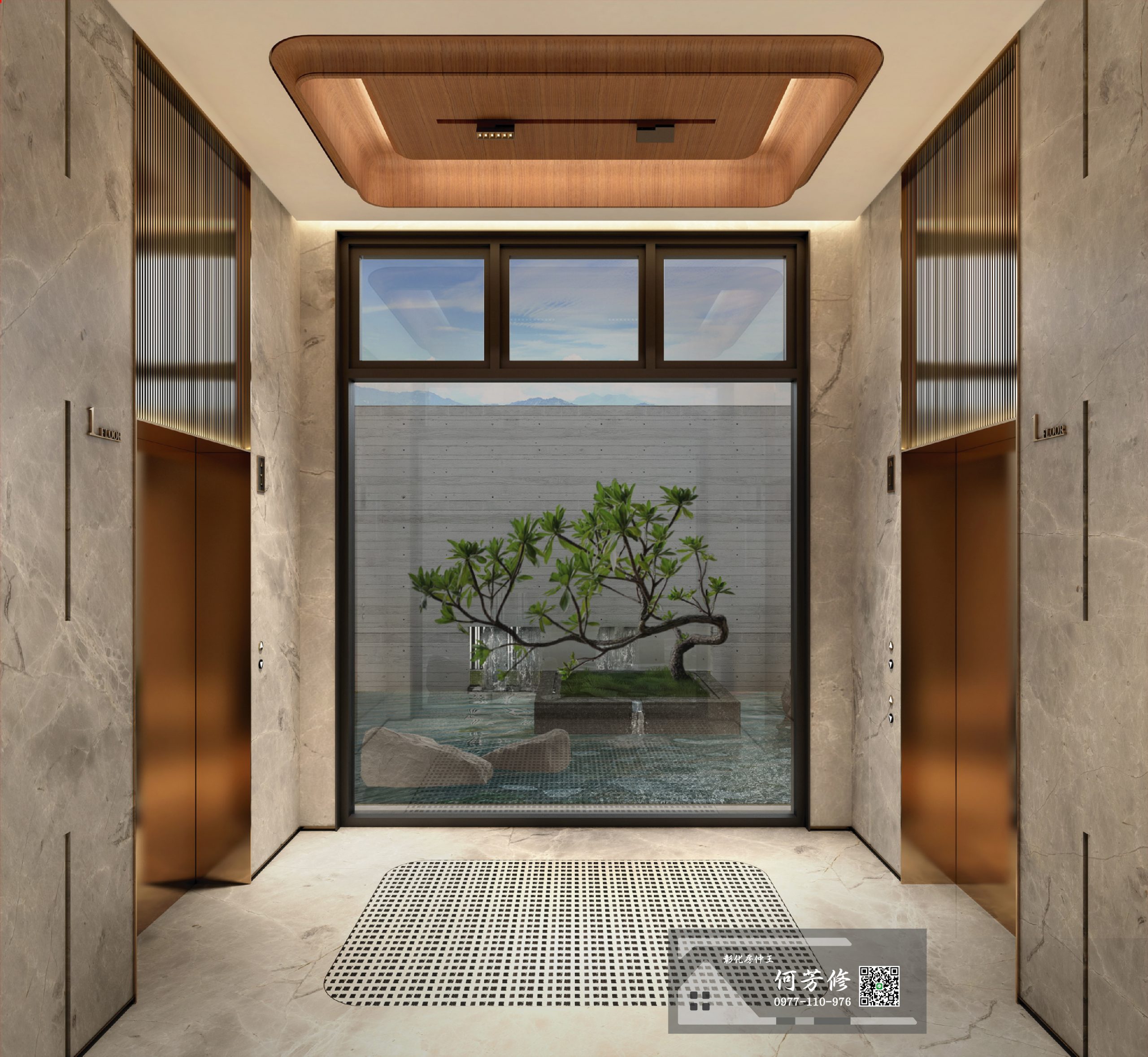 梯廳以低調華美古銅烤漆,搭配石材拼接,結合窗外一幅雍容老樹的生成,拓印風光流動,姿態萬千四季各有殊異,等待的時間因一片天光而更怡人。