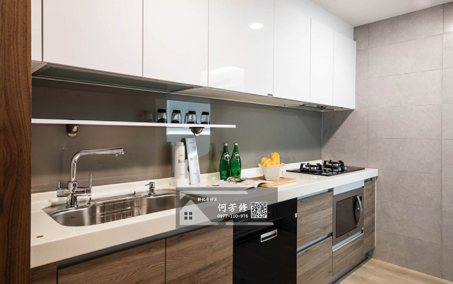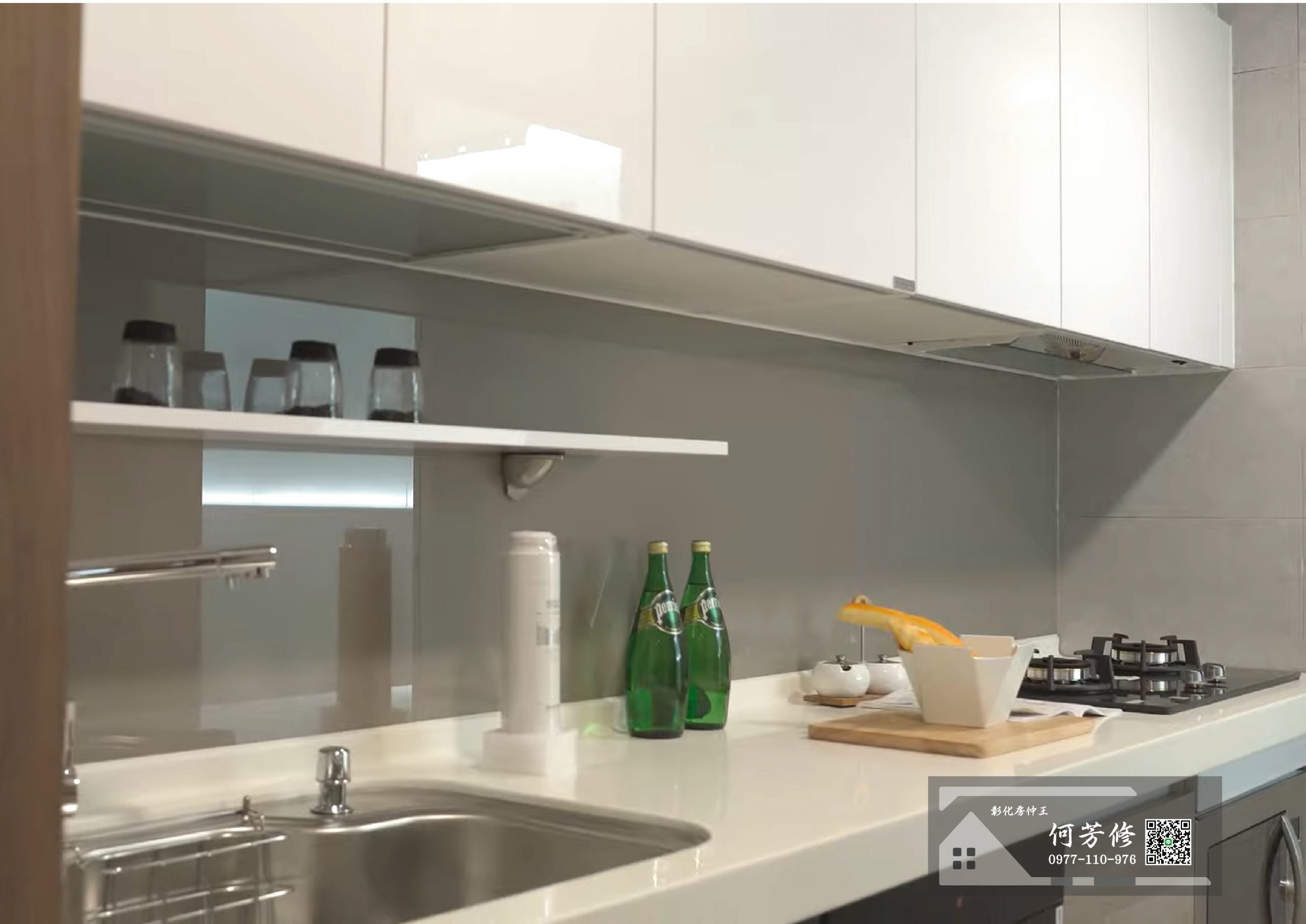 - 廚房:牆面1:3粉刷刷水泥漆(青葉、虹牌、ICI或同等級)搭配壁磚30公分*60公分磁磚,廚具上下櫃間貼烤漆玻璃。