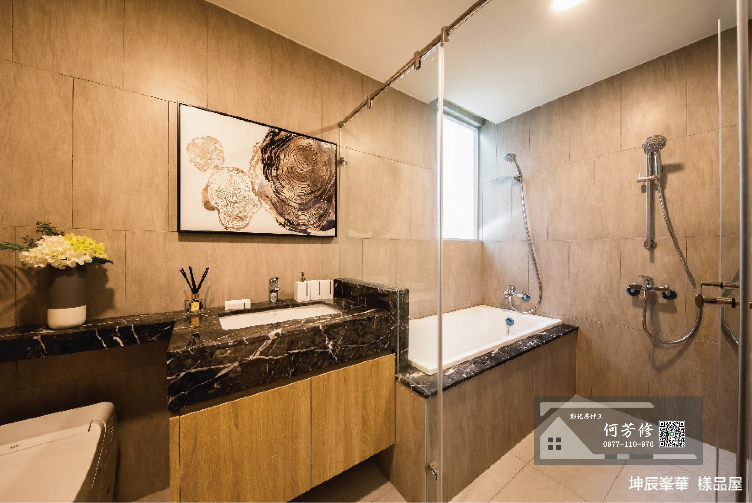 - 主體:TOTO分離式馬桶含一般馬桶座、石材檯面TOTO下崁盆、強化玻璃淋浴拉門(附人造石門檻)。