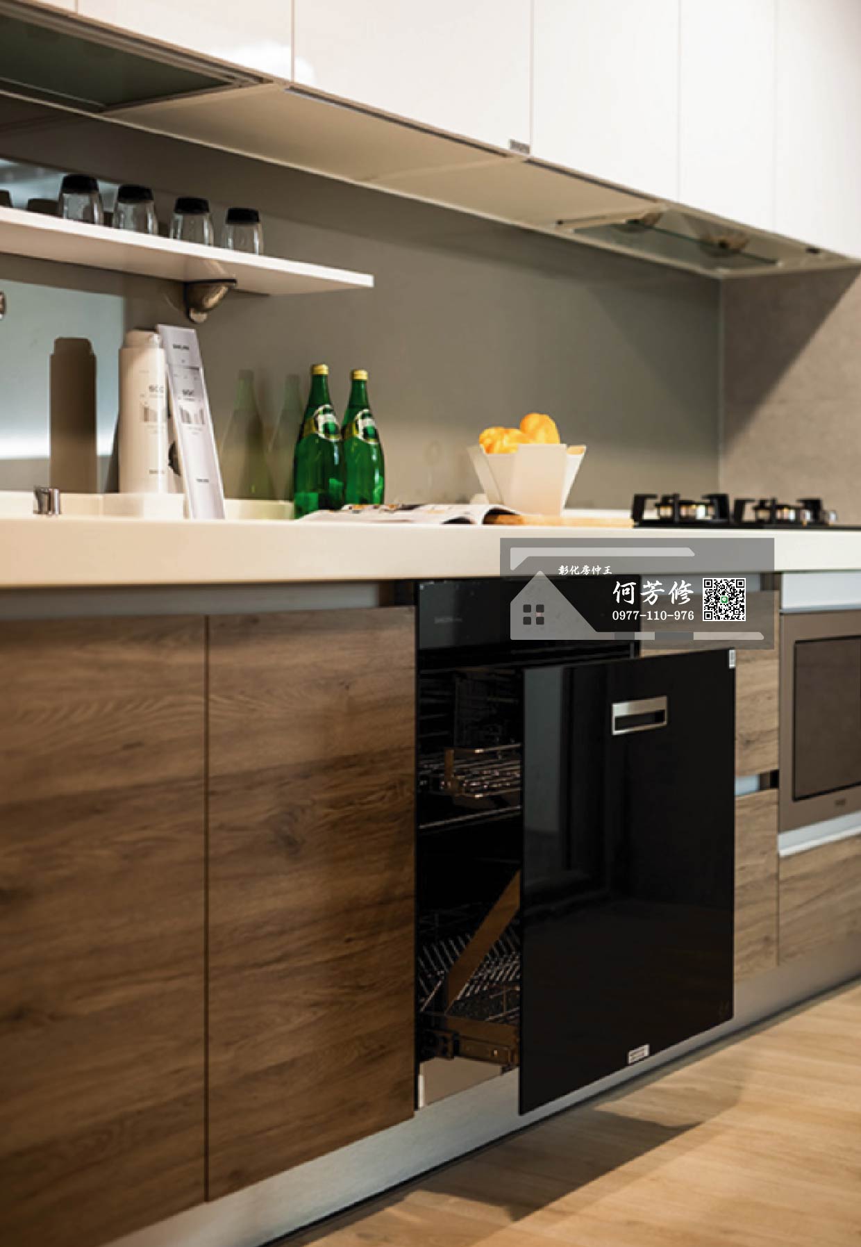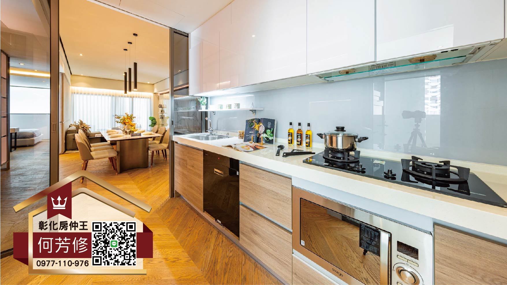 廚房為獨立空間,採用全套臺灣櫻花廚具,包括廚下淨水器、微波烤、層架全都是標配,特大號的檯面,讓備料完全不必考慮空間大小,需要什麼瓶罐碗盤,全部放上檯面就對了!還享有免費廚房健檢及售後服務,實用時尚兼具。