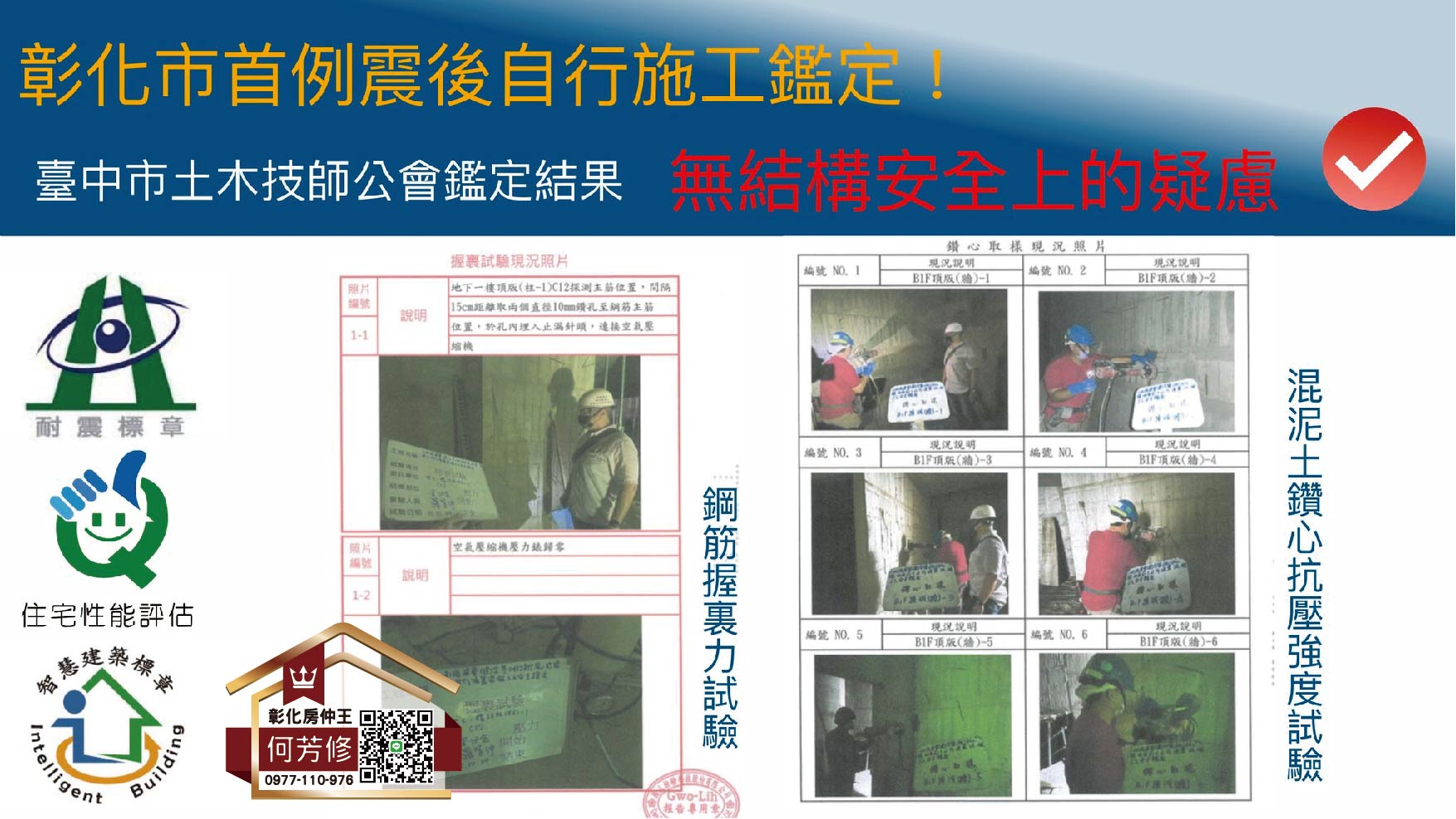 專業的建築團隊、有公信力的檢測單位,為您的居住安全把關。依「建築物施工管制辦法」規定,地震震度達4級以上地區,於震前7日內有澆置混凝土的施工中建物,起造人、承造人、監造人應檢測該樓層結構安全並提出建物安全證明書。