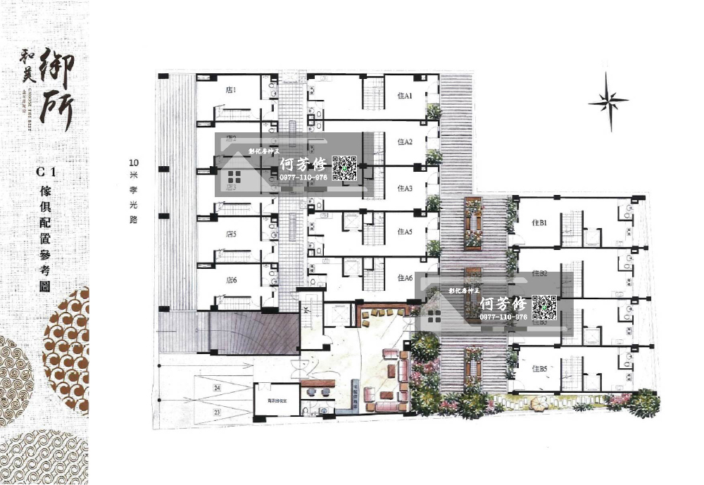 - 棟戶規劃:1棟,18戶住家,5戶店面