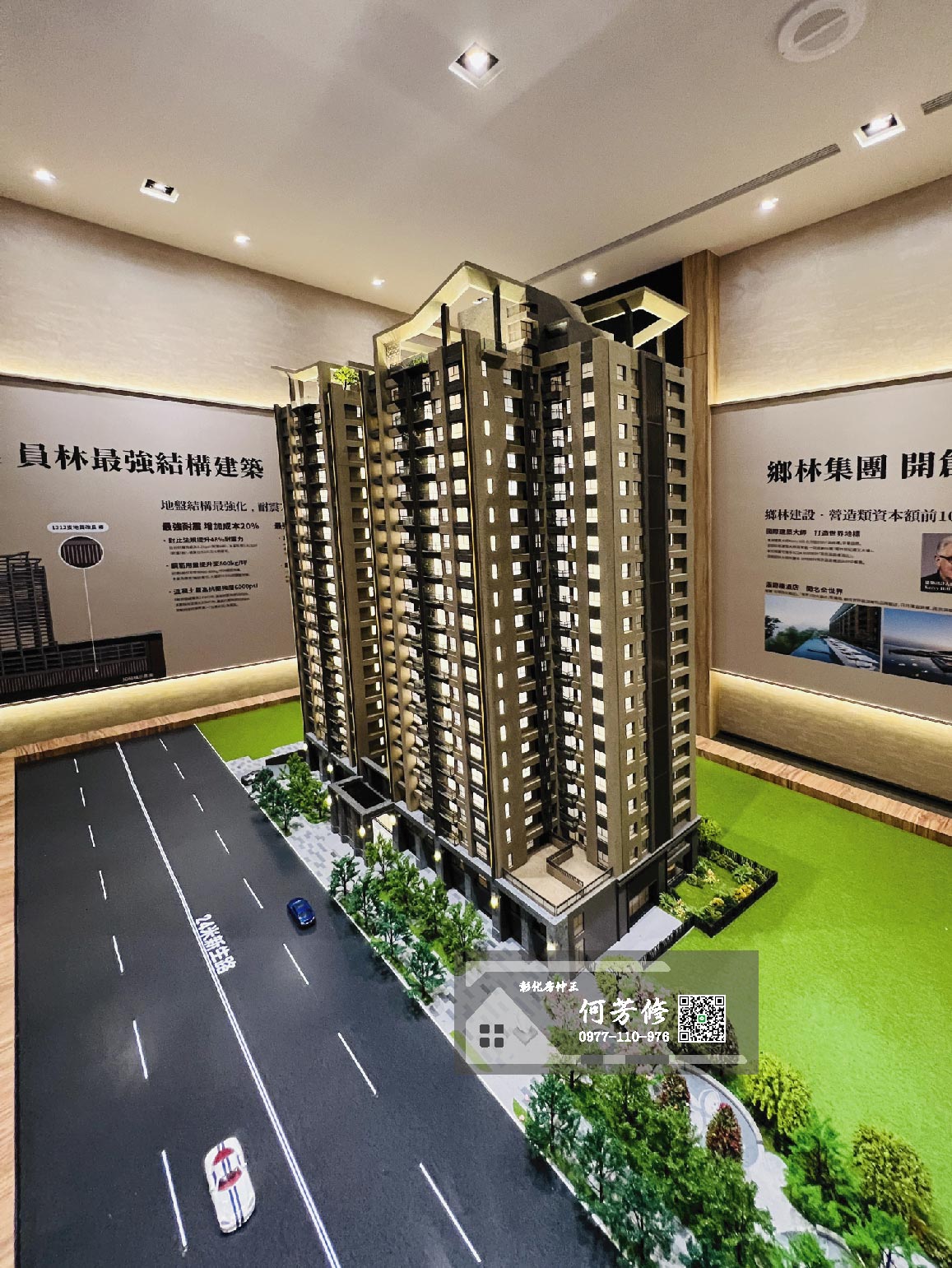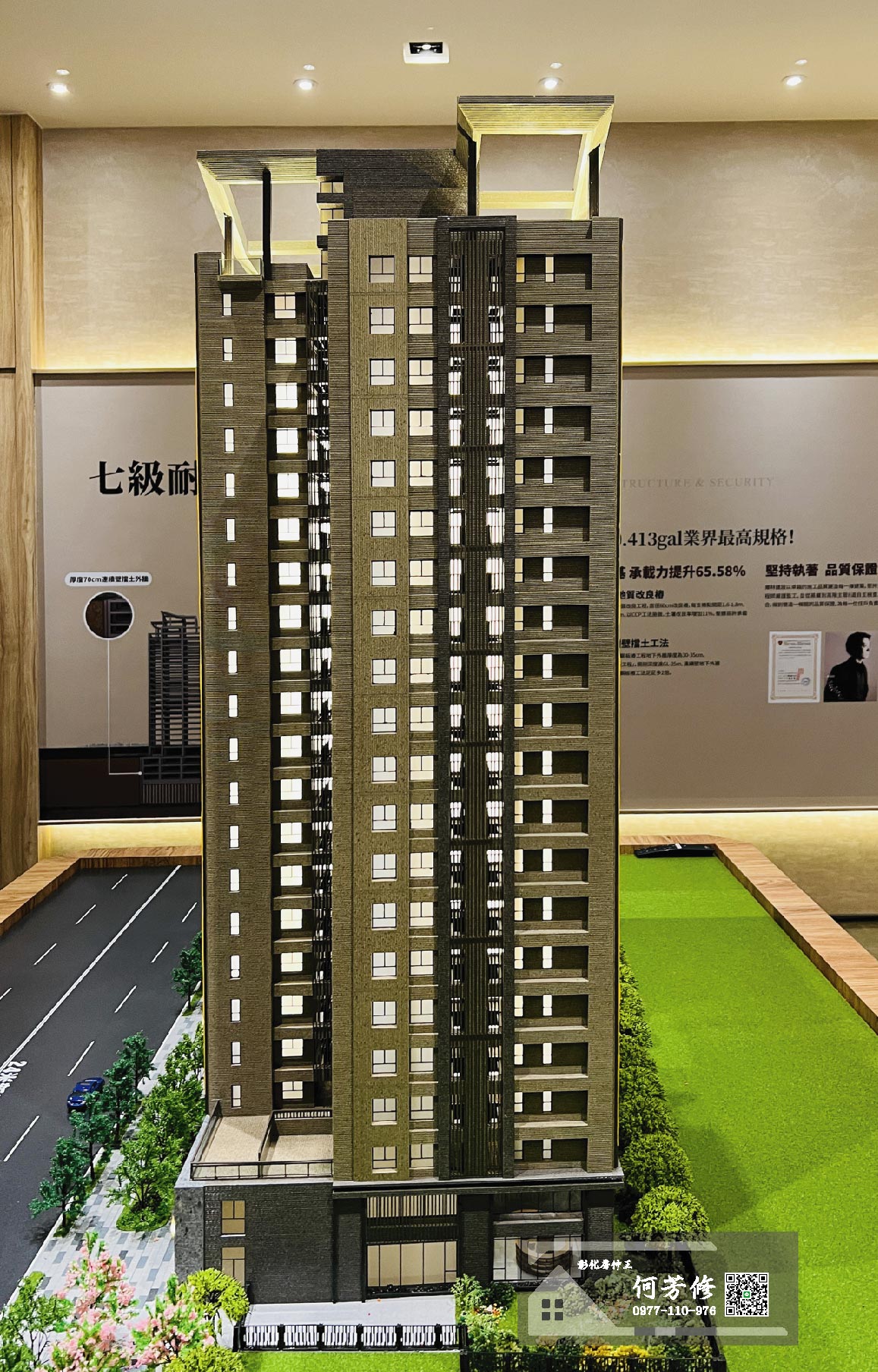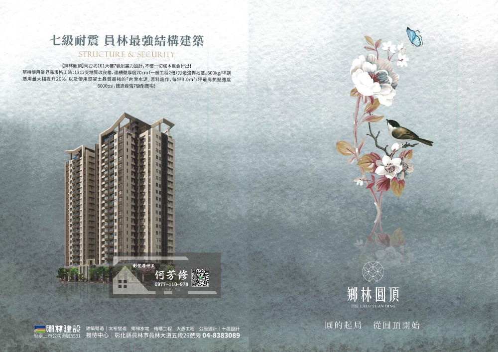 且根據建築法規-耐震設計規範要求,若依六級耐震設計,每建坪鋼筋用量約480至500Kg,混凝土用量為2.5立方米,抗壓強度為5,000PSI;但董事長要求建築師與結構技師,務必要做到跟台北101大樓同樣的耐震七級設計耐震結構工程,鋼筋用量每建坪達580至600Kg,用量增加20%以上;混凝土使用品質最強的「台灣水泥」原料施作,每建坪的混凝土用量達3立方米,最高抗壓強度為6,000PSI,讓結構更穩固、安全,還可降低搖晃程度,堪稱員林住宅營建史上的最高規格,也是全員林最受矚目的新地標建築。