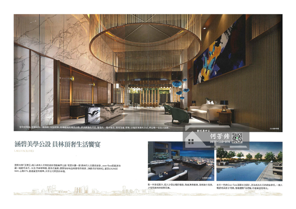 生活美學上,一手打造涵碧樓的鄉林集團,特別針對本案挹注涵碧度假美學,由北中豪宅御用名師「王勝正」操刀公設,融入員林人文特色設計涵碧美學公設:氣派內斂的迎賓大廳、咖啡輕食空間、1F戶外游泳池、健身房、宴會廳、瑜伽室、兒童遊戲區、迴廊式書牆,並於頂樓規劃空中Lounge Bar、心聚KTV、頂樓的好客BBQ和有機菜園,高達十多項的公設,帶給住戶一種全新的生活體驗,讓回家就像天天在度假,共享三代同堂的幸福。