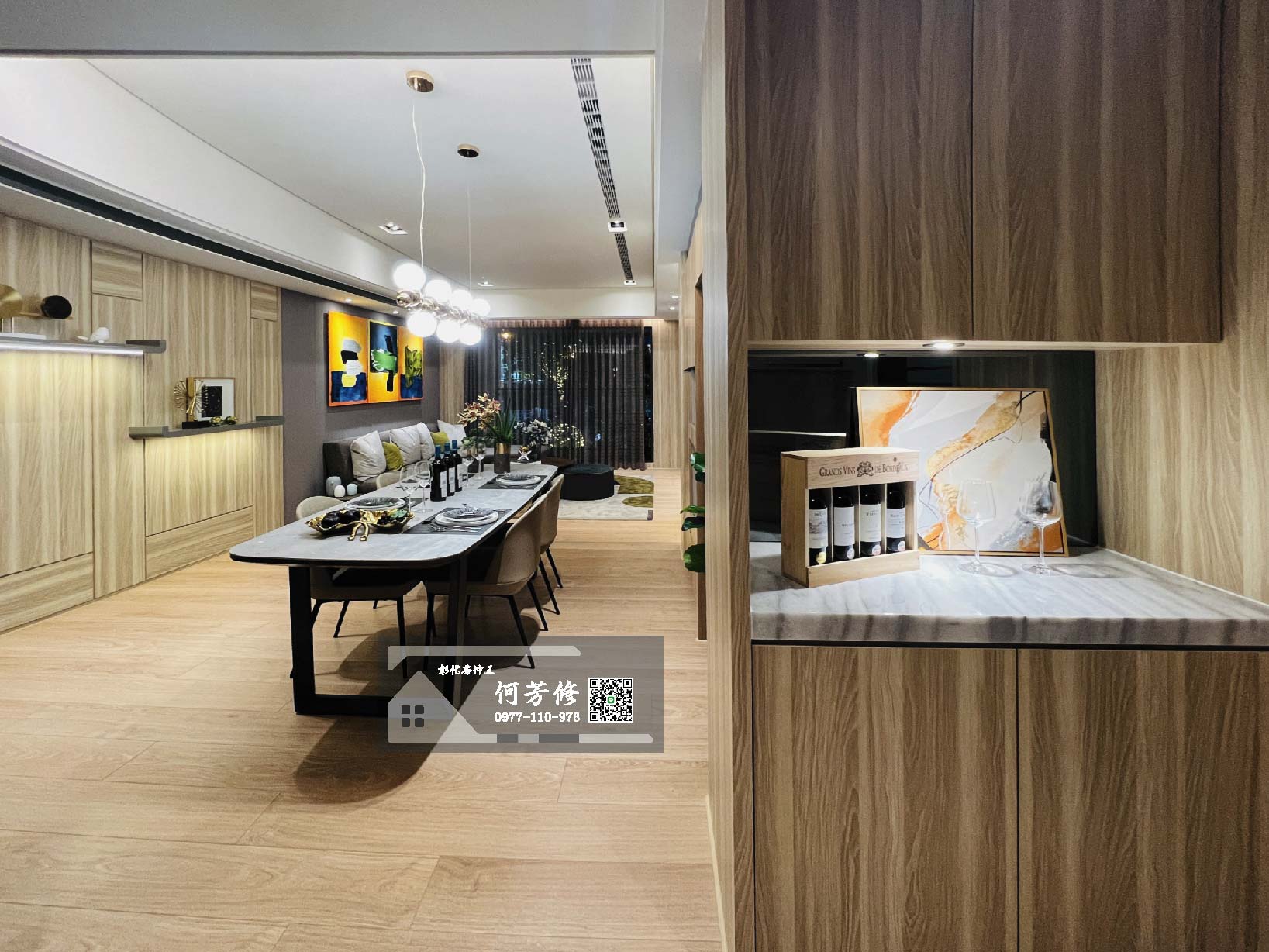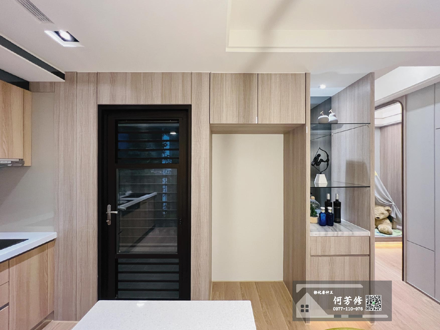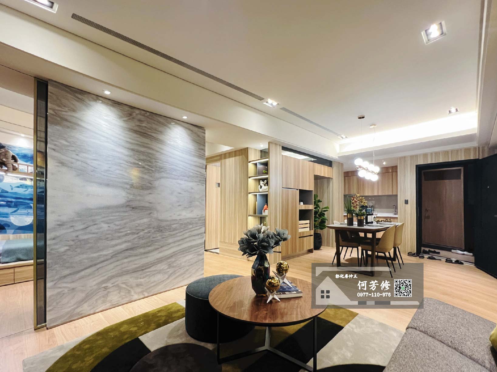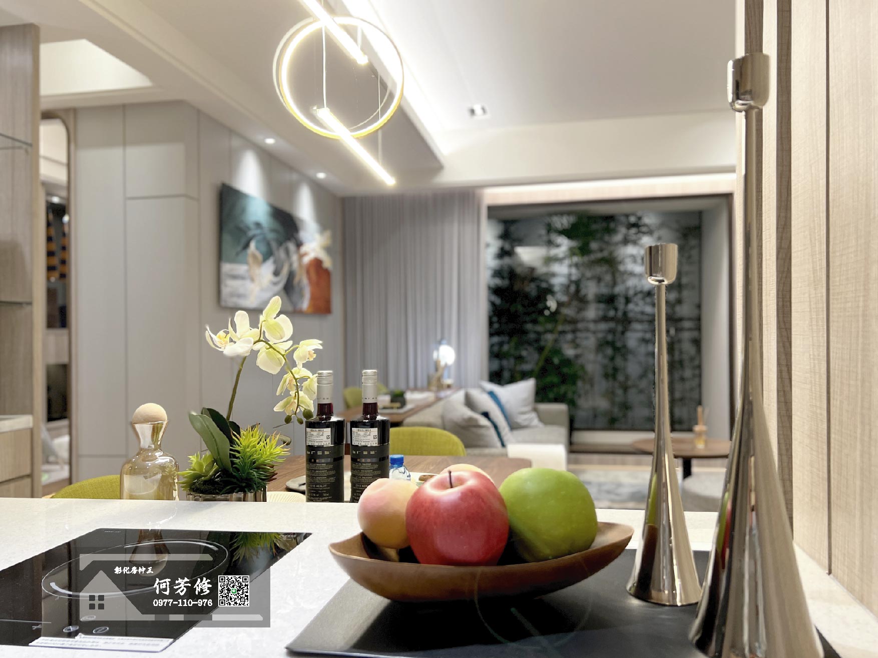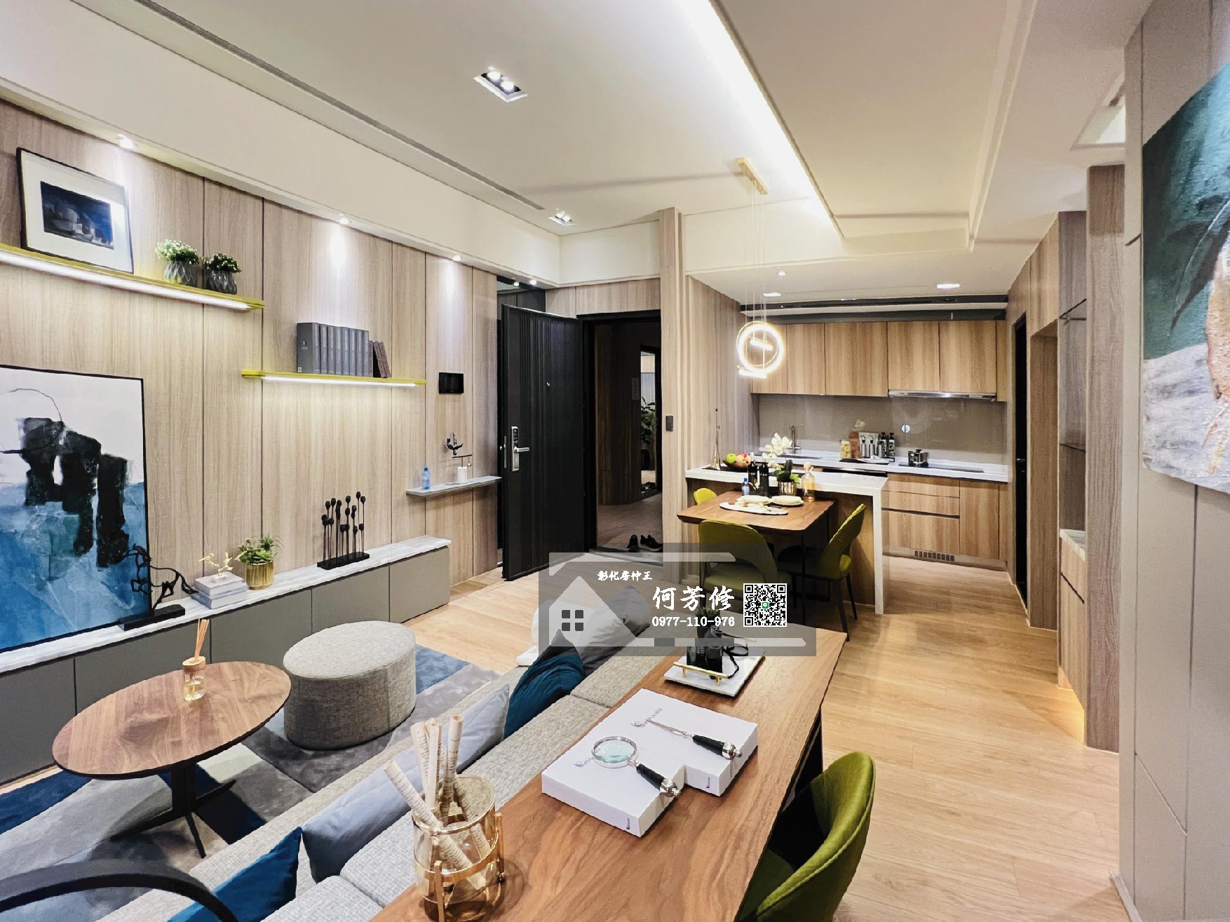 此圖為入門口、廚房、飯廳及客廳全景。