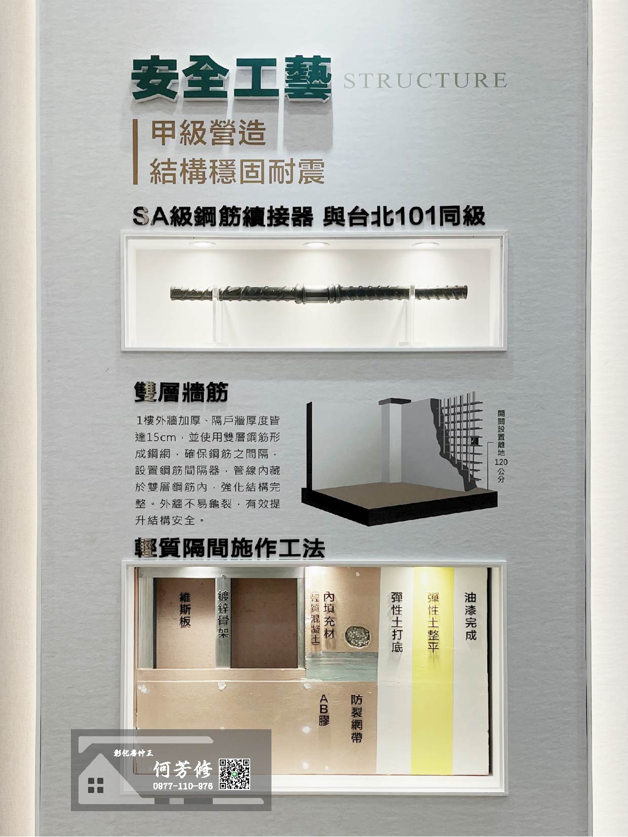 全部外牆、隔戶牆厚度皆達15公分,並使用雙層鋼筋形成鋼網,確保鋼筋之間隔,設置鋼筋間隔器,管線內藏於雙層鋼筋內,強化結構之完整。外牆不易龜裂,能有效提升結構之安全性。