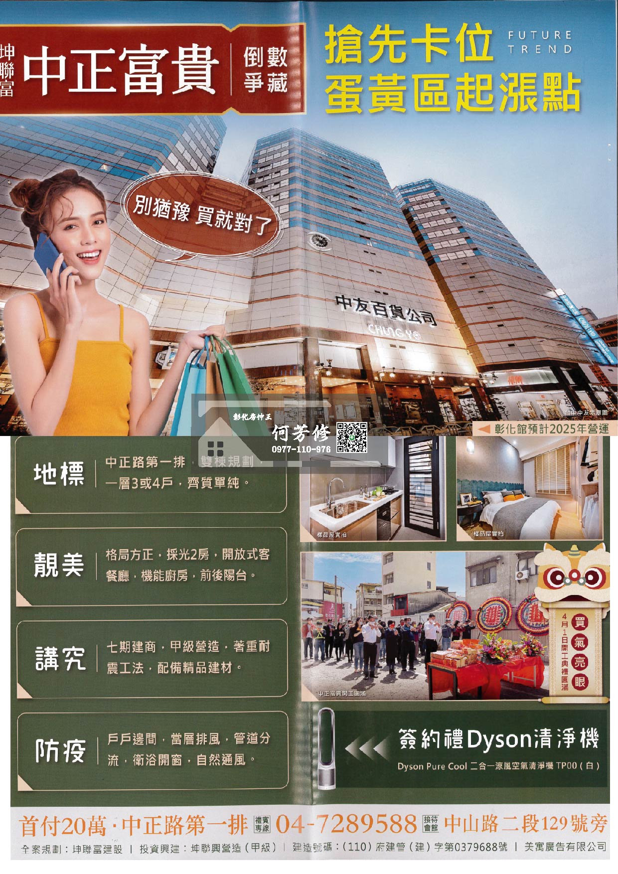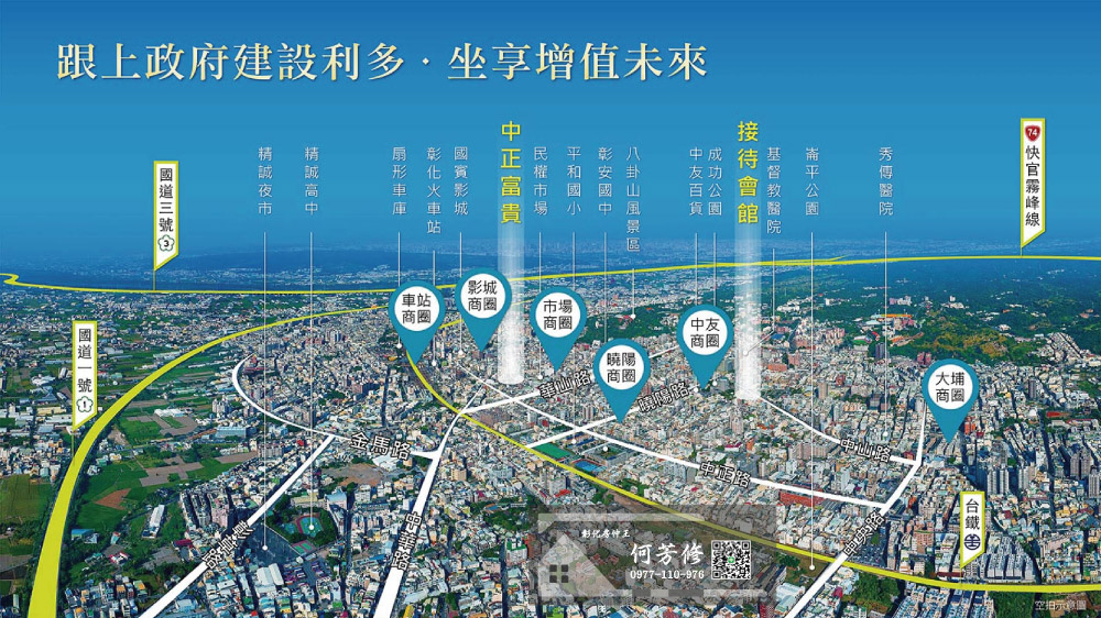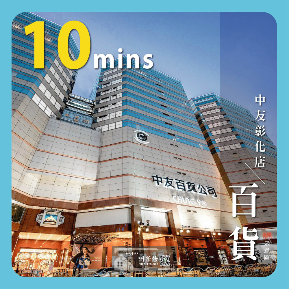至於發展性,最近中友百貨集團宣布要進駐,為彰化市投下震撼彈,地上14層樓的綜合商城,規模與台中的中友相當,集餐飲、影城、文創、健身中心於一身,「坤聯富 中正富貴」完工前就會迎接開幕營運的盛況,距基地只要車程10分鐘。屆時國賓影城也已完工,接著就等台化70公頃的新重劃區、綠線捷運延伸金馬站,議題一波波,綿延無絕期。