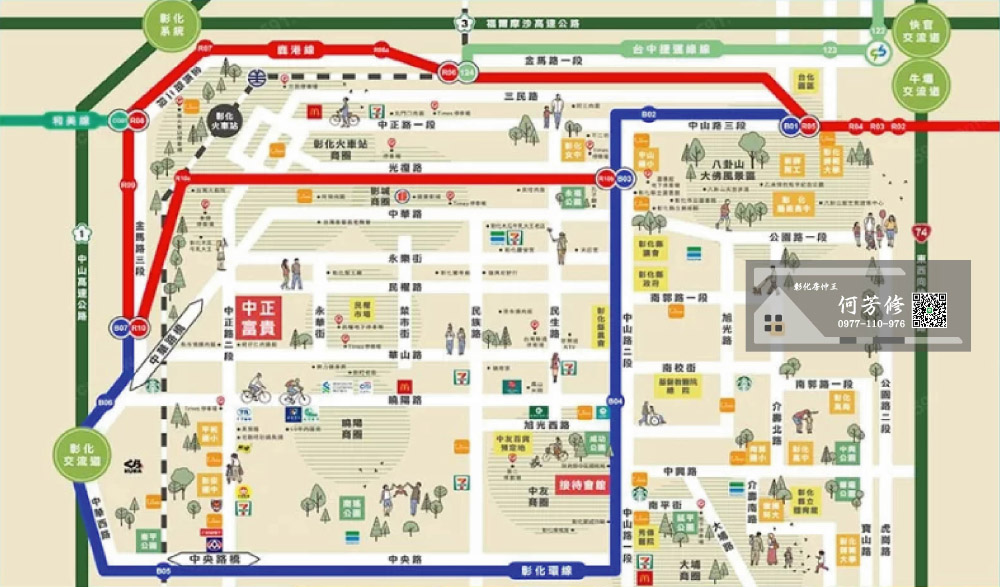 小環境的機能也很難挑剔,國小、國中、火車站、客運站、市場、大小商店、藥局診所,全都是走一會兒就到,鄰近學區含括平和小學、彰安國中、彰化女中、彰化師範大學…等,孩子以後上學、補習的通勤都省心了。