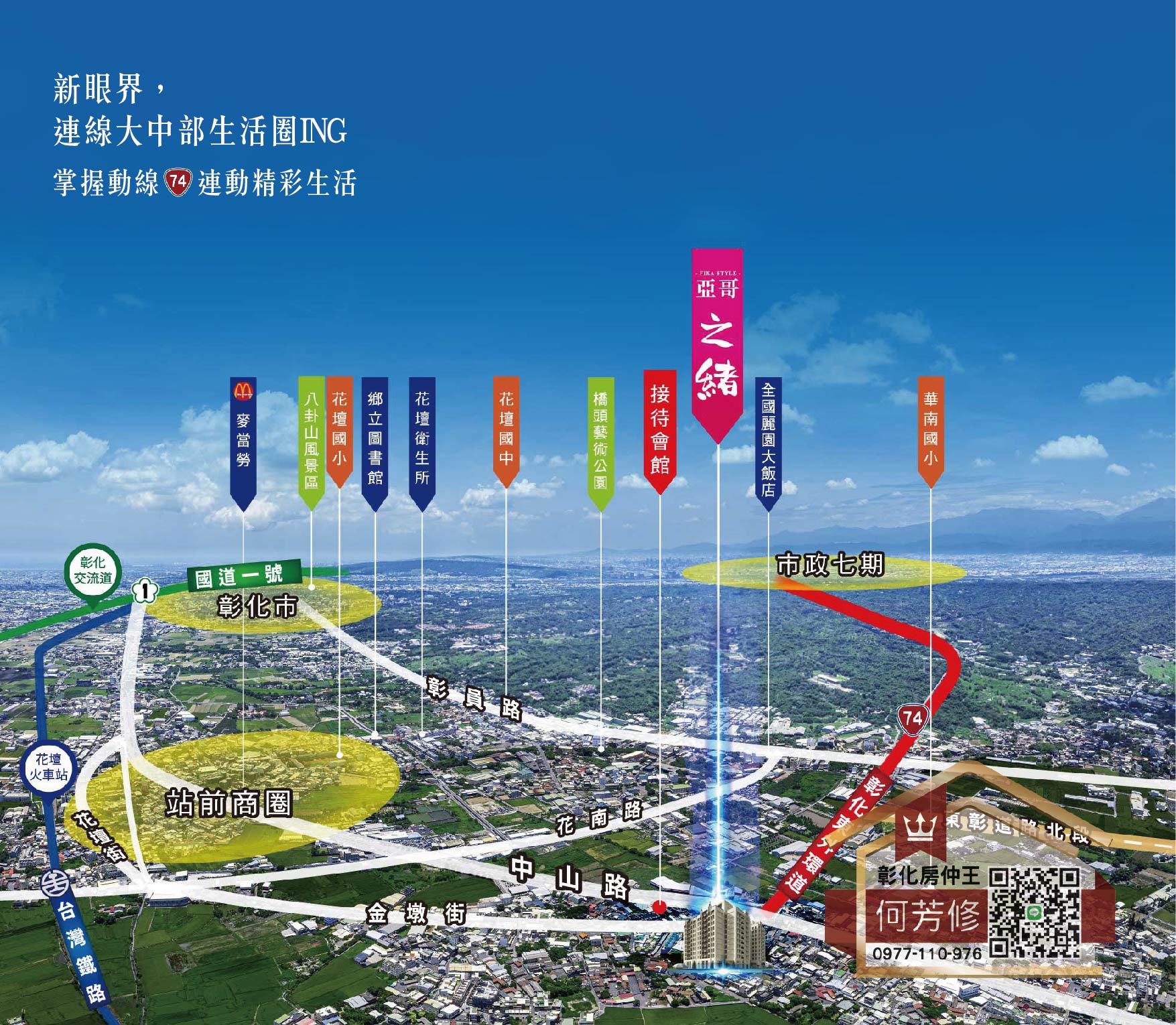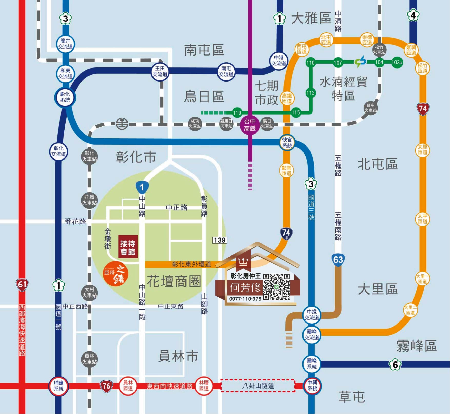 沿著台74中彰快速道路兩旁的八卦山景綠色脈絡走下,到達74甲線的T字型交匯處,那裡連接了台中、彰化及員林的台1線省道。