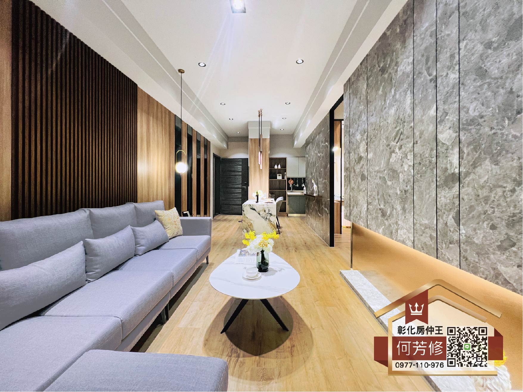 參觀完了3房格局後,正對面便是巧思滿滿的2房1衛樣品屋。設計師巧妙地規劃L型公領域,從入門玄關、廚房、中島餐桌,一直延伸至客廳和陽台。當從玄關踏入,即可感受到明亮的採光,視野也隨之一片開闊,直通客廳的陽台。