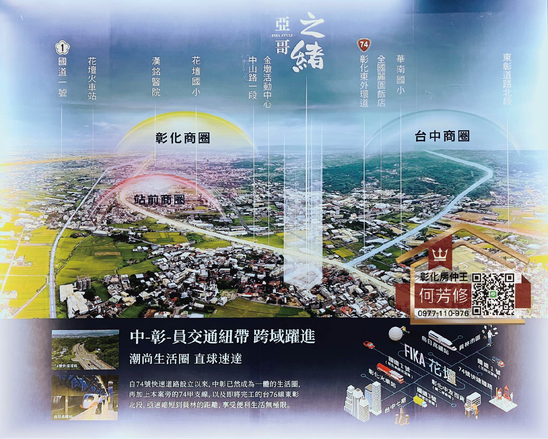自74號快速道路設立以來,中彰已然成為一體的生活圈,再加上本案旁的74甲支線,以及即將完工的台76線東彰北段,極速縮短到員林的距離,享受便利生活無極限。