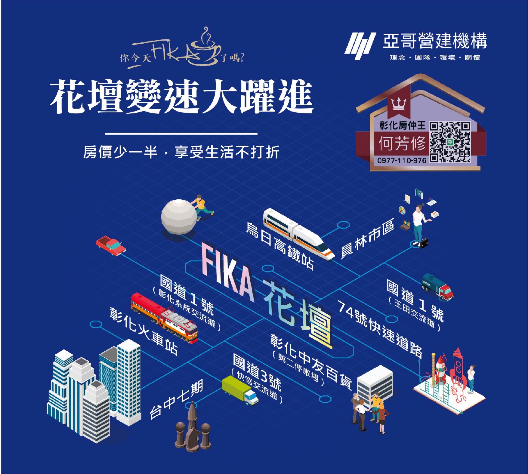 交通方面,約5分鐘車程可至花壇車站,亦有國道1號、74快速道路及76快速道路可利用,輕鬆往來各縣市。