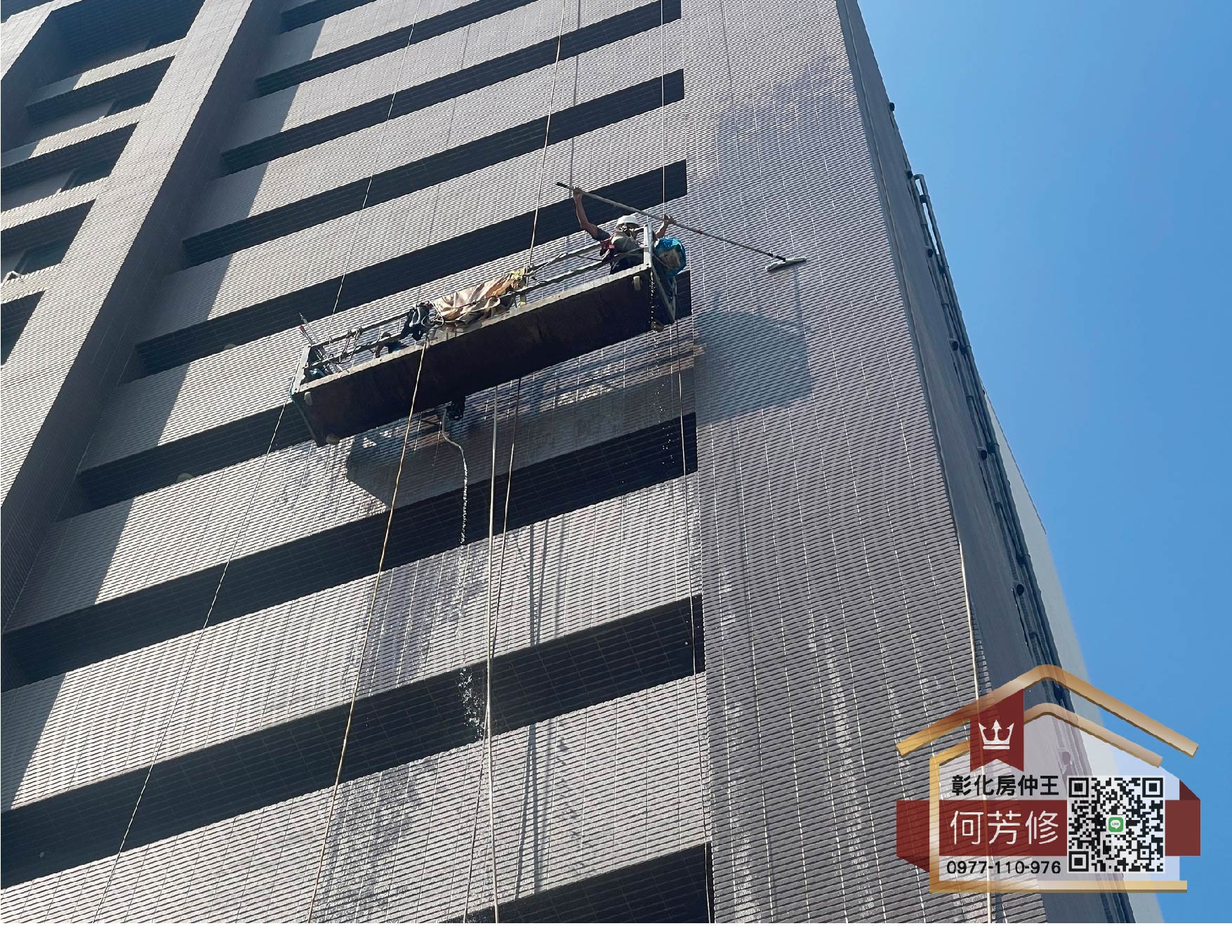 外牆清洗一般以高空吊車進行作業,經過高壓洗刷,將褪去因為施工而蒙在表面的粉塵,展露出大樓光鮮的一面。外牆清潔不只是清洗髒污更是要將大樓的美一點點的沖刷展現在眾人的眼前。